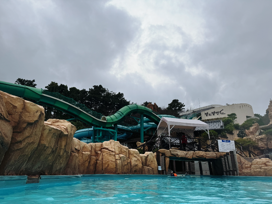 실내스파에서 밖으로 나오면 유수풀과 워터슬라이드가 있고 중간중간 스파가 있는 워터파크입니다. 부분휴장때문에 점검 중이 많았지만 다행히 워터슬라이드 마스터블라스터는 운행 중이었답니다. 사람들이 많이 없어 마스터블라스터를 5번이나 탔는데요 :-) 슬라이드 타는 곳까지 계단을 올라가야 했지만 너무 재미있었답니다. 엄마도 타셨는데 올라가기 힘들다고 한 번만 타셨어요. 여기서 잠깐! 마스터블라스터 재미있게 타는 법 알려드릴게요~ 처음엔 아무것도 모르고 고개를 들고 탔는데 목이 너무 아팠답니다. 그다음 탈 땐 몸을 최대한 뒤로 뉘어서 천장을 보고 탔는데 이 자세가 더 재미있답니다. 고개를 들고 타면 앞이 보여서 여기가 어디쯤인지 알고 타게 되는데 누우면 어디쯤인지 몰라 더 재미있답니다~